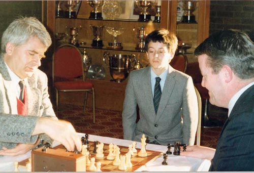 Caption | Boris Spassky on his way to a 6-0 skittles match win over Eamon Keogh, Fitzwilliam Tennis Club, Dublin 1994. Keogh: "Will you not give me a break Boris?". Spassky: "Sorry Eamon, it was only my hand playing". |