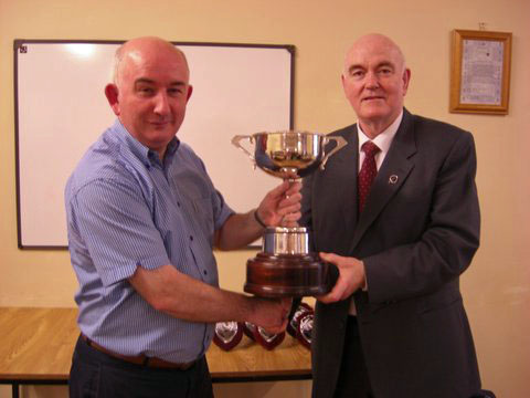 Charlie Talbot, LCU President, presents the William Brennan Cup to Frank Pentony, left